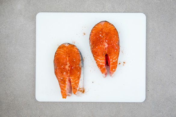 Den Lachs mit etwas Küchenkrepp trocken tupfen. Vorsicht, der Fisch kann Gräten enthalten! Diese ggf. jetzt mit einer Pinzette entfernen oder beim Essen darauf achten! Die Lachssteaks von beiden Seiten mit der 1/2 der Gewürzmischung einreiben und leicht salzen.