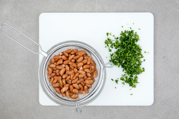 Die Bohnen in einem Sieb abtropfen lassen. Den Koriander samt Stängeln fein hacken.