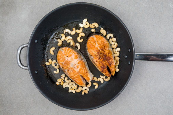 Den Lachs in einer großen Pfanne mit 1EL Olivenöl bei mittlerer Hitze für 2–3Min. von jeder Seite anbraten. Die Cashewkerne hinzugeben und die Pfanne vom Herd nehmen, die Hitze reicht noch aus, um die Cashews leicht anzurösten. Den Fisch bis zum Servieren in der Pfanne ruhen lassen.