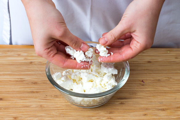 Inzwischen den Käse mit den Fingern fein zerkrümeln. Sollte der Eintopf zu dickflüssig sein, noch mehr Wasser zugeben.