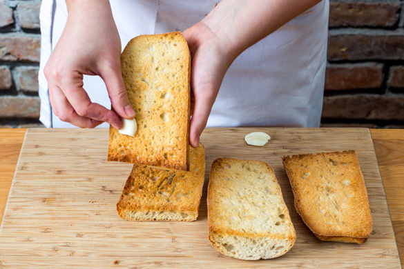 Die Brötchen quer halbieren, aufschneiden und neben dem Eintopf für ca. 6–7Min. knusprig aufbacken. Die zweite Knoblauchzehe schälen und halbieren und mit der Schnittfläche die Innenseiten der Brote einreiben.