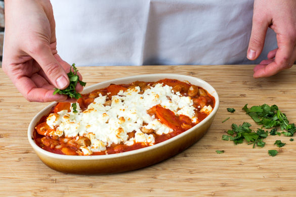 Den überbackenen Eintopf nach Geschmack mit frischem Koriander garnieren und mit den Knoblauchbroten servieren.