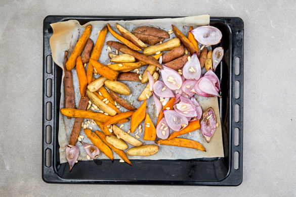 Den Backofen auf 220°C Umluft (240°C Ober-/Unterhitze) vorheizen. Die Süßkartoffeln und die Kartoffeln in ca. 2–3cm breite Spalten schneiden. Die Karotten schälen, längs halbieren und in ca. 3–4cm lange Stücke schneiden. Alles auf ein mit Backpapier ausgelegtes Backblech geben.
