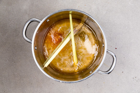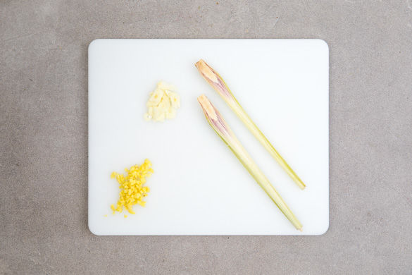 Den Ingwer schälen und in kleine Würfel schneiden. Tipp: Der Ingwer lässt sich am besten mit einem kleinen Löffel schälen. Den Knoblauch schälen und in hauchdünne Scheibchen schneiden. Die Zitronengrasstange längs halbieren.