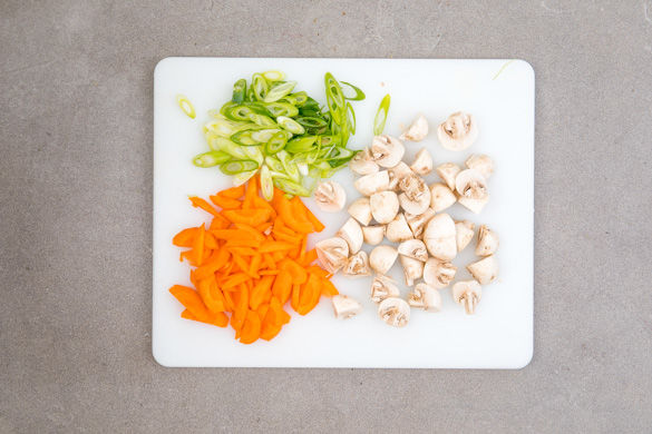 Die Pilze ggf. mit etwas Küchenkrepp oder einer Pilzbürste säubern und je nach Größe vierteln oder sechsteln. Die Karotten schälen, längs halbieren und schräg in möglichst dünne Scheiben schneiden. Die Lauchzwiebel in schräge, dünne Ringe schneiden.