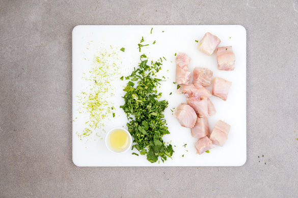 Den Koriander samt Stängeln grob hacken. Die Limettenschale abreiben, dann die Limette halbieren und auspressen. Den Fisch mit etwas Küchenkrepp trocken tupfen und in ca. 2–3cm große Würfel schneiden. Vorsicht, der Fisch kann Gräten enthalten. Diese am besten jetzt mit einer Pinzette entfernen oder später beim Essen darauf achten!