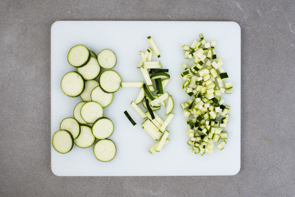 Die Enden der Zucchini abschneiden und die Zucchini in ca. 0,5cm dünne Scheiben schneiden, die Scheiben in ca. 0,5cm dünne Stifte, die Stifte zu kleinen Würfeln schneiden.