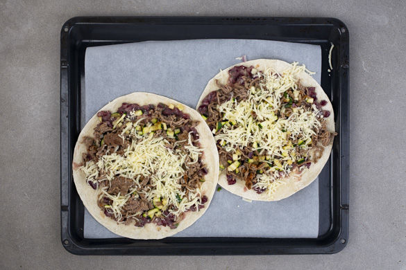 Die 1/2 der Tortillas auf zwei mit Backpapier ausgelegte Backbleche geben, dünn mit Bohnenpaste bestreichen – es sollte Paste übrig bleiben –, die Hackmasse darauf verteilen und mit Käse bestreuen. Mit den restlichen Tortillas bedecken, diese leicht andrücken und die Quesadillas ca. 6–7Min. im Ofen backen, bis sie goldbraun sind und der Käse geschmolzen ist.