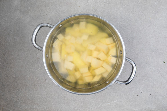 Den Ofen auf 200°C Umluft (220°C Ober-/Unterhitze) vorheizen. In einem mittelgroßen Topf ausreichend leicht gesalzenes Wasser zum Kochen bringen. Die Kartoffeln schälen und je nach Größe halbieren oder vierteln. Die Steckrübe schälen, in ca. 2cm große Stücke schneiden. Sobald das Wasser kocht, das Gemüse hineingeben und in ca. 15–20Min. weich kochen.