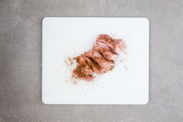 Das Schweinefilet mit etwas Küchenkrepp trocken tupfen, in 6 etwa gleich große Medaillons schneiden und mit dem Lebkuchengewürz einreiben.