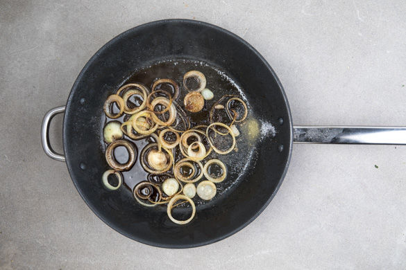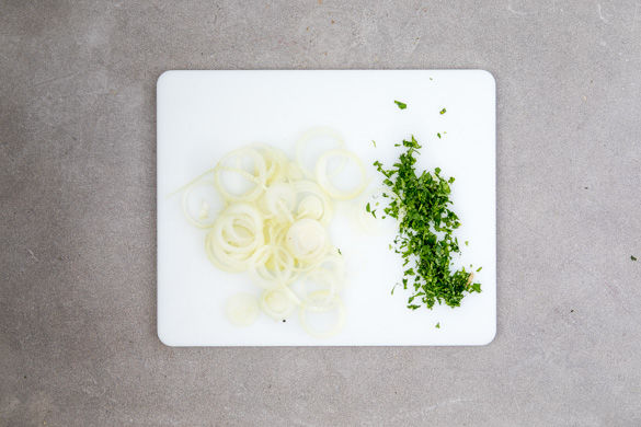 Die Zwiebeln schälen und in feine Ringe schneiden. Die einzelnen Zwiebelringe voneinander lösen. Die Petersilienblätter abzupfen und fein hacken.