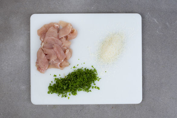 Die Hähnchenbrust mit etwas Küchenkrepp trocken tupfen und in dünne Streifen schneiden. Den Käse fein reiben. Den Kerbel samt Stängeln fein hacken.