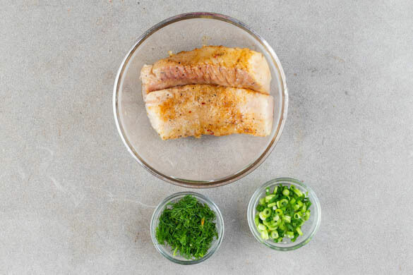 Den Dill von den harten Stängeln zupfen und grob schneiden. Die Lauchzwiebeln schräg in dünne Ringe schneiden. Den Fisch mit kaltem Wasser abspülen, trocken tupfen und evtl. vorhandene Gräten mit einer Pinzette entfernen. Anschließend mit insgesamt 1EL Pflanzenöl und der restlichen Gewürzmischung vorsichtig einreiben und mit je 1 Prise Salz und Pfeffer würzen.
