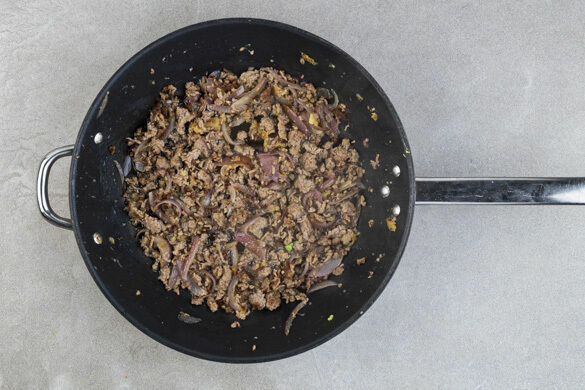 Das Hackfleisch in die Pfanne geben und unter häufigem Rühren 2–3Min. krümelig braten. Das Fleisch soll noch nicht ganz durchgaren.