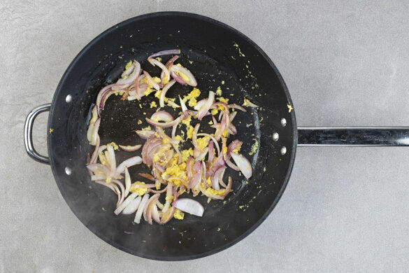 Die Zwiebel schälen, halbieren und in feine Streifen schneiden. Die Zwiebel in einer großen Pfanne mit 1EL Pflanzenöl und 1 Prise Salz bei mittlerer Hitze 2–3Min. anbraten. Dann die Knoblauch-Ingwer-Paste unterrühren und ca. 30Sek. mitbraten.