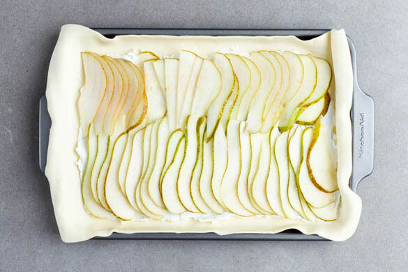 Die Birnen leicht überlappend auf dem Ziegenfrischkäse verteilen. Tipp: Ggf. übrige Birnen am nächsten Tag mit weiteren Früchten und etwas Honig oder Zucker zu einem Obstsalat vermengen.