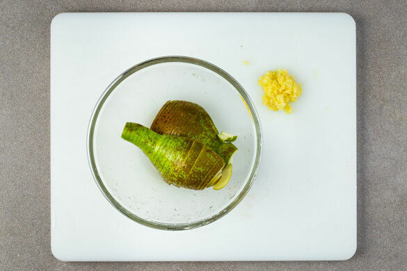 Den Backofen auf 220°C (200°C Umluft) vorheizen. Den Ingwer schälen und reiben, sodass sich eine Menge von ca. 1EL Ingwer ergibt. Die Birnen halbieren, entkernen und in dünne Scheiben schneiden. Die Zitrone halbieren und eine Hälfte auspressen. Die andere Hälfte wird für dieses Rezept nicht benötigt. Die Birnen mit dem Zitronensaft vermengen und beiseitestellen.