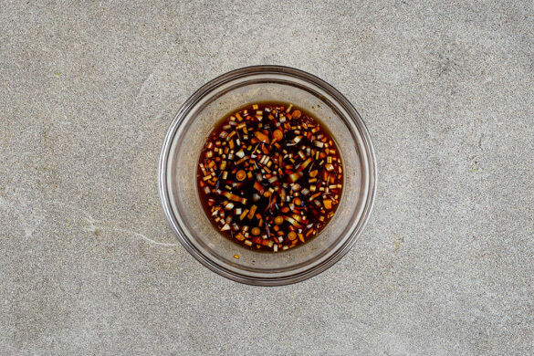 Den Limettensaft, die Sojasauce, das Zitronengras, den Knoblauch und 2TL Zucker in einer kleinen Pfanne bei mittlerer Hitze 1–2Min. erwärmen, bis sich der Zucker auflöst. Das Dressing in eine große Schüssel geben und mit 2EL Wasser verrühren. Die Pfanne auswischen.