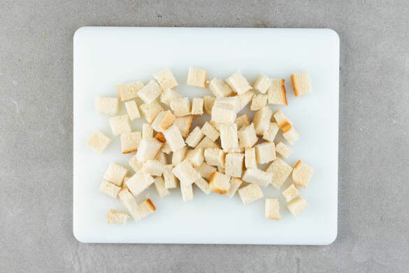 Die Toastscheiben aufeinanderstapeln und in ca. 1cm große Würfel schneiden.