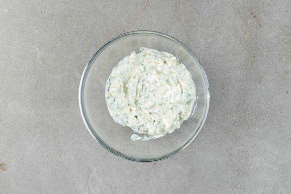 Die Petersilienblätter von den Stängeln zupfen und fein schneiden. Den Schnittlauch ebenfalls fein schneiden. Tipp: Wer möchte, kann auch die Petersilienstängel klein schneiden und verwenden. Den Käse mit dem Joghurt, den Kräutern, 1TL körnigem Senf und 1 kräftigen Prise Pfeffer in eine Schüssel geben.