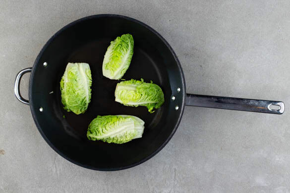 Die Salathälften in der bereitgestellten Pfanne bei starker Hitze mit den Schnittseiten nach unten ca. 2Min. goldbraun anrösten. Etwas Dressing auf Tellern verstreichen, die Salathälften daraufgeben und mit der Roten Bete, den Birnen und den Croûtons garnieren. Den Salat nach Geschmack mit mehr Dressing beträufeln und servieren.