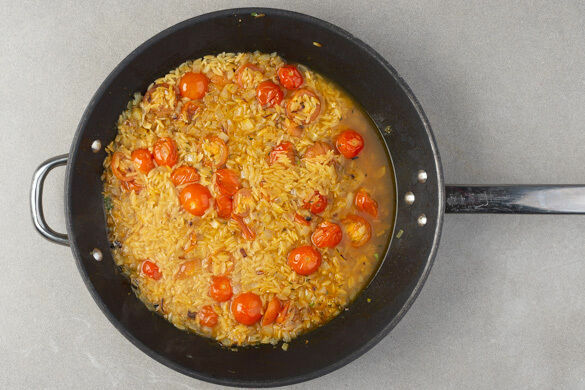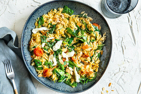 Im Italienischen bedeutet das Wort „Orzo" Gerste, während in anderen Teilen der Welt die reisförmige Pastasorte Risoni damit gemeint ist. Nur um Missverständnissen vorzubeugen: Das heutige Gericht ist gerstenfrei, man könnte also auch von einem „Risoniotto" sprechen. Wie man es auch nennt, lecker ist es auf jeden Fall! Kirschtomaten sind die Basis, mit Spinat, Zitrone und Basilikum wird’s besonders aromatisch. Yum!