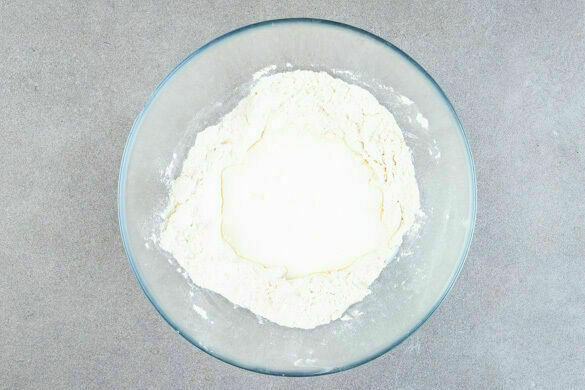 30g Butter mit den Fingerspitzen in den Mehl-Zucker-Mix einarbeiten, sodass eine gleichmäßige, bröselige Textur entsteht. Die Milch dazugeben und alles locker zu einem groben Teig verkneten. Nicht zu lange kneten, sonst wird der Teig zu fest.