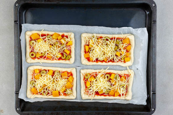 Die Tomatensauce auf den Teigstücken verstreichen, die Paprika und die Oliven darauf verteilen und den Käse darüberstreuen. Die Pizzen im Ofen in 10–15Min. goldbraun und gar backen. Je nach Ofen die Position der Bleche nach der Hälfte der Backzeit tauschen.