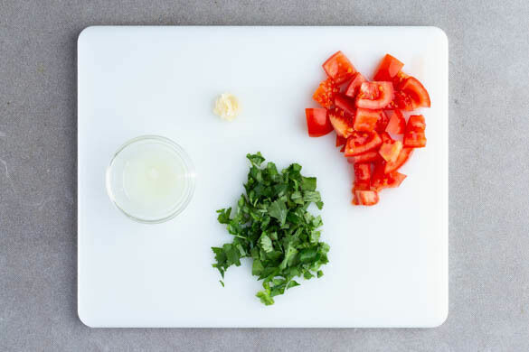 Die Limetten halbieren und auspressen. Den Knoblauch schälen und durch eine Knoblauchpresse drücken oder sehr fein hacken. Den Koriander samt Stängeln grob schneiden. Die Tomaten grob würfeln. Die Karotte ggf. schälen und grob raspeln.