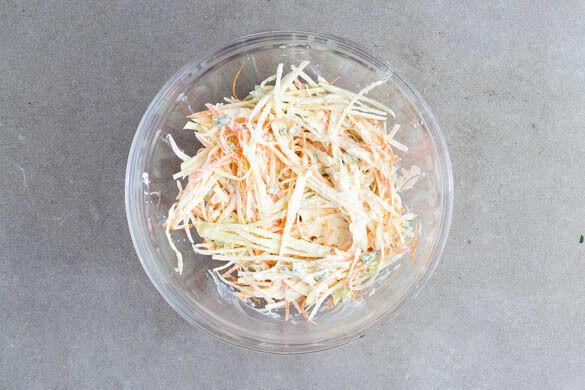 Den Weißkohl und die Karottenraspel gründlich mit dem Crème-fraîche-Dressing verkneten, bis das Gemüse etwas weicher wird.