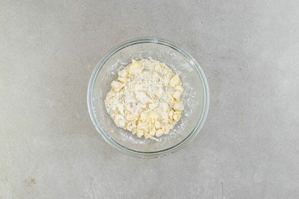 Den Backofen auf 230°C (210°C Umluft) vorheizen. 2EL Mehl beiseitestellen, das restliche Mehl mit 2TL Zucker und ½TL Salz vermengen. Die Pistazien fein hacken und untermischen. Die kalte Butter in ca. 1cm große Würfel schneiden, dabei schnell arbeiten, damit sie nicht zu weich wird. Die Butter mit der Mehlmischung vermengen und zwischen den Fingern zerdrücken.