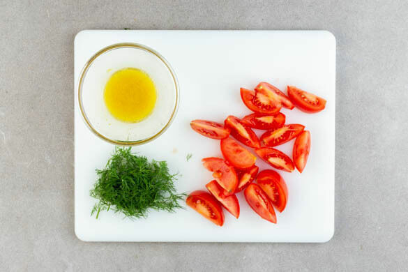 Die Zitrone halbieren und auspressen. Den Dill samt Stängeln grob schneiden. Die Tomaten in Spalten schneiden. Den Zitronensaft mit 2EL Olivenöl und 2TL Senf verrühren. Mit den restlichen Kapern, den Tomaten und dem Wildkräutersalat vermengen, mit Salz und Pfeffer abschmecken. Die Galettes mit dem Dill garnieren und den Salat dazu reichen.