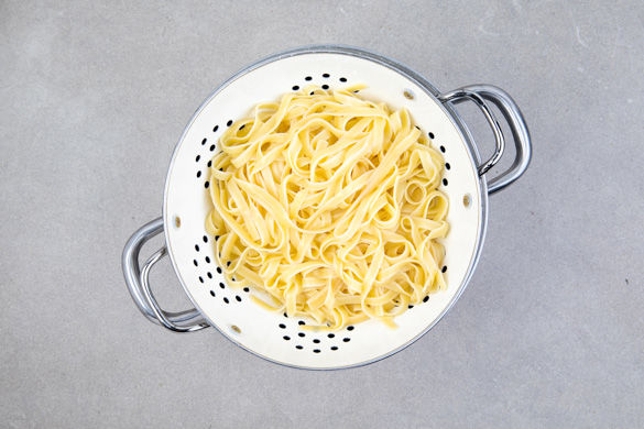 Sobald das Wasser kocht, die Nudeln hineingeben und für ca. 8–9Min. bissfest kochen. Mit einer Tasse etwas Pastawasser abschöpfen, dann die Nudeln in ein Sieb abgießen und abtropfen lassen.
