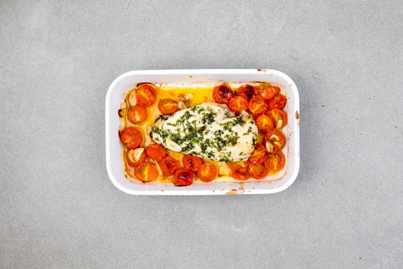 Die Tomaten, den Knoblauch und das Hähnchen für ca. 12–15Min. im Ofen backen, bis das Fleisch goldbraun und in der Mitte durchgegart ist. Je nach Dicke des Fleisches kann die Garzeit variieren.
