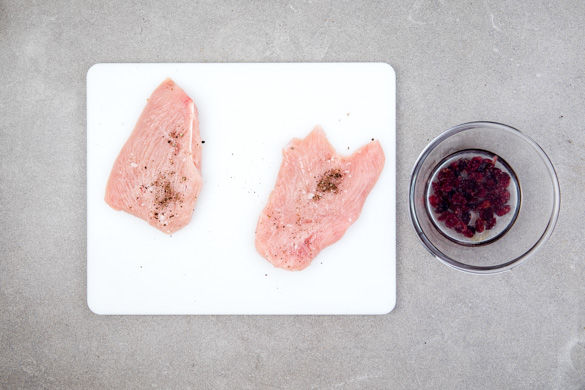 Das Putenbrustfilet mit etwas Küchenkrepp trocken tupfen und mit Salz und Pfeffer würzen. Die Cranberrys in etwas heißem Wasser einweichen.
