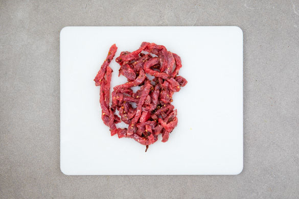 Das Fleisch mit etwas Küchenkrepp trocken tupfen und mit 1–2EL Olivenöl und 1/3 der Gewürzmischung vermengen. Abgedeckt beiseitestellen.