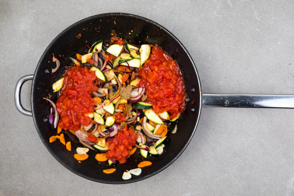 In derselben Pfanne 1EL Olivenöl erhitzen und die Zwiebeln, den Knoblauch, die Zucchini und die Karotten bei mittlerer Hitze ca. 3–4Min. anbraten. Mit den gehackten Tomaten ablöschen und den Brühwürfel darin auflösen. Die Gemüsepfanne mit der restlichen Gewürzmischung, 1 Prise Zucker, Salz und Pfeffer abschmecken.
