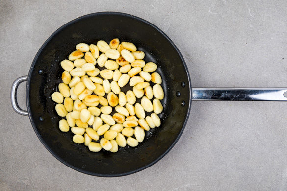 Die Gnocchi in einer großen Pfanne – ggf. in zwei Durchgängen – mit 2–3EL Olivenöl bei mittlerer Hitze ca. 6–8Min. goldbraun anbraten.