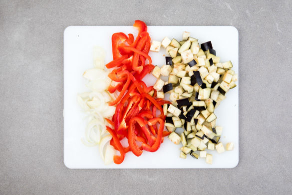 Die Zwiebel schälen, halbieren und in dünne Scheiben schneiden. Den Knoblauch schälen und in feine Scheibchen schneiden. Die Paprika vierteln, entkernen und in ca. 0,5cm dünne Streifen schneiden. Die Aubergine in ca. 1cm große Würfel schneiden.