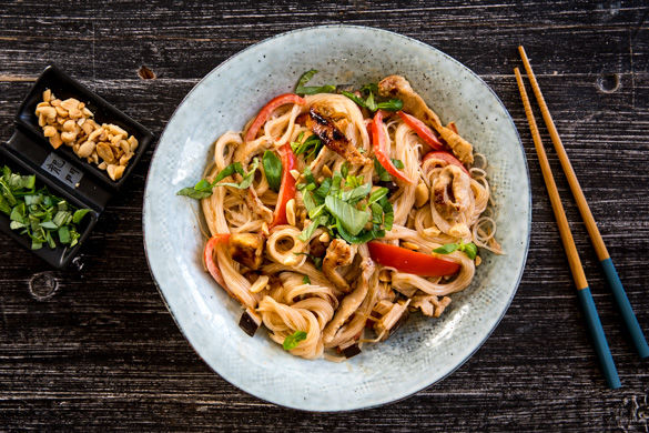 Das Schweinefleischcurry mit der restlichen Currypaste nach Geschmack und Schärfewunsch sowie Salz abschmecken. Die Glasnudeln unter das Curry heben und das Curry mit Erdnüssen und Basilikum garniert servieren.