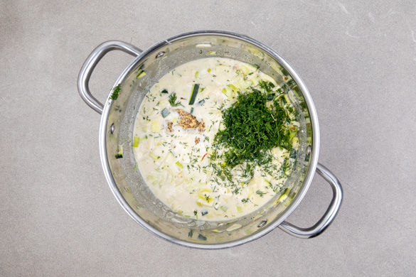 Die Zucchini und den Knoblauch in den Topf geben und alles für 3–4 Min leicht köcheln lassen. Den Schmand unterrühren, aber nicht mehr kochen lassen.