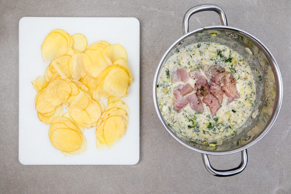 Den Fisch mit etwas Küchenkrepp trocken tupfen und in ca. 2cm große Stücke schneiden. Vorsicht, der Fisch kann Gräten enthalten. Diese am besten jetzt mit einer Pinzette entfernen. Die Fischwürfel salzen und pfeffern, in den Topf geben und vorsichtig umrühren. Den Topf vom Herd nehmen. Die Kartoffeln samt Schale in möglichst dünne Scheiben schneiden.