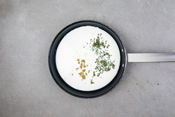 Den Knoblauch schälen und fein hacken. Die Thymianblätter von den Stängeln streifen. In einer kleinen Pfanne die Sojasahne, den 1/2 Brühwürfel, den Knoblauch und den Thymian verrühren und kurz aufkochen lassen. Die Sauce vom Herd nehmen und mit Salz und Pfeffer würzen.