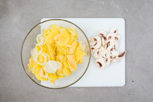 Die Kartoffeln, die Steckrübe und die Zwiebel mit einer Küchenreibe oder einem Gemüsehobel in ca. 2–3mm dünne Scheiben hobeln. Wer mag, kann das Gemüse auch mit einem Messer in möglichst dünne Scheiben schneiden. Das Gemüse mit 1 Prise Salz vermengen. Die Pilze in dünne Scheiben schneiden.