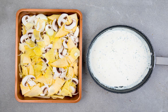 Die Kartoffel-, die Steckrüben-, die Zwiebel- und die Pilzscheiben in einer Auflaufform gleichmäßig abwechselnd schichten und die Sauce darübergeben.