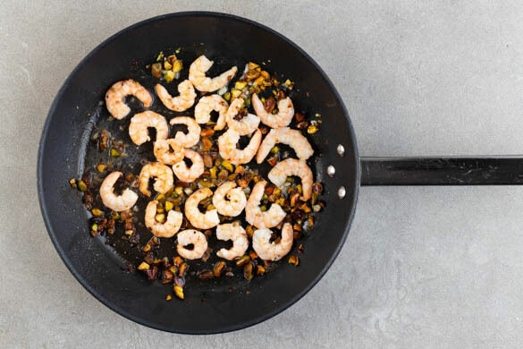 Den Knoblauch schälen und fein würfeln. Die Pistazien grob hacken. Die Garnelen in einem Sieb mit kaltem Wasser abspülen und mit etwas Küchenkrepp trocken tupfen. Die Pistazien in einer mittelgroßen Pfanne mit 1EL Olivenöl bei starker Hitze ca. 2Min. anrösten, dann den Knoblauch und die Garnelen hinzufügen und weitere 2–3Min. braten, bis die Garnelen pink und gar sind.