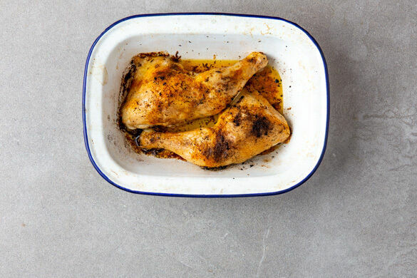 Die Hähnchenschenkel in eine Auflaufform geben und 25–30Min. im Ofen goldbraun und knusprig backen, bis die Haut leicht Blasen wirft und das Fleisch durchgegart ist.