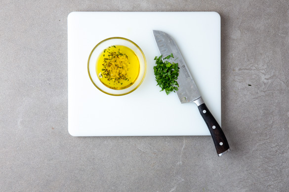 Den Knoblauch schälen und fein würfeln. Die Oreganoblättchen von den Stängeln streifen und fein hacken. Den Knoblauch und den Oregano mit 2EL Olivenöl verrühren und beiseitestellen. Die Petersilie samt Stängeln fein hacken.