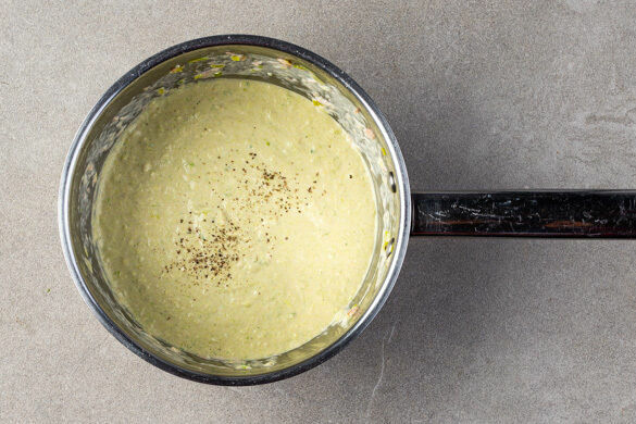 Die Lauchstreifen in einem kleinen Topf mit 2EL Olivenöl bei mittlerer Hitze ca. 2Min. anschwitzen. Den Thunfisch, den Knoblauch und 2EL Wasser unterrühren und 2–3Min. mitköcheln. Wenn der Lauch weich ist, die Crème fraîche unterrühren und alles mit einem Stabmixer pürieren. Mit der Limettenschale, dem Limettensaft sowie Salz und Pfeffer abschmecken.
