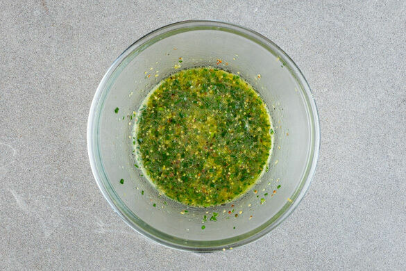 Die Zitronenschale abreiben, dann die Zitrone halbieren und eine Hälfte auspressen. Die übrige Hälfte wird für dieses Rezept nicht benötigt. Den Schnittlauch in kleine Röllchen schneiden, dann mit dem Zitronensaft, ½TL Zitronenschale, 1TL Senf sowie je 1 Prise Salz und Pfeffer verrühren. Langsam 2EL Olivenöl unterrühren und alles gut vermengen.